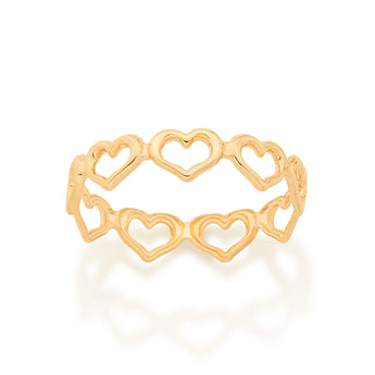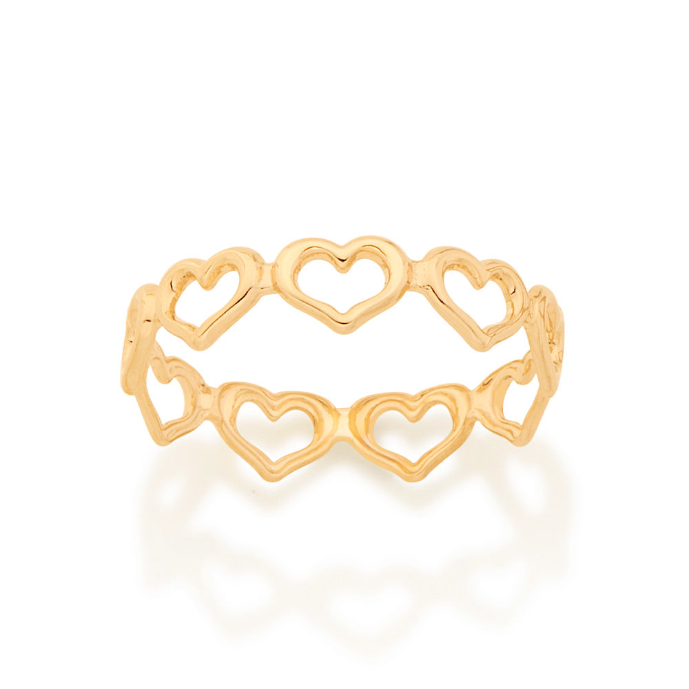 Rommanel's 2020 collection, colors of life, shows us that every color takes us to a special moment, memory, feeling, or experience in our life. by putting all those colors together, we have an amazing understanding and experience of life. in our collection's subcategoy, self love, we focused on creating stunning pieces that bring positive attitude, self confidence, and self love. gold plated skinny ring composed of small hearts next to each other to create the band. | material: 18k gold plated. | also available in rhodium. (licensed jewelry collection 2020 - 1st cycle)"