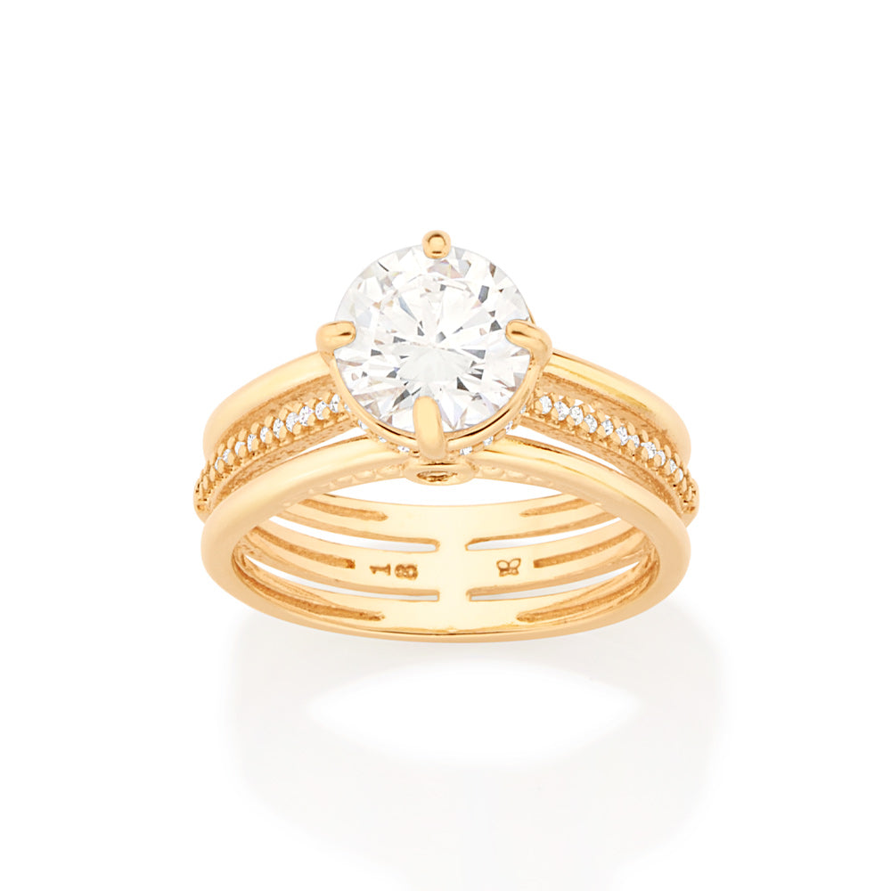 Gold plated engagement ring studded with 48 white circle zirconias measuring 0.8mm on the band and 1 white circle zirconia measuring 8mm at the center.