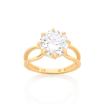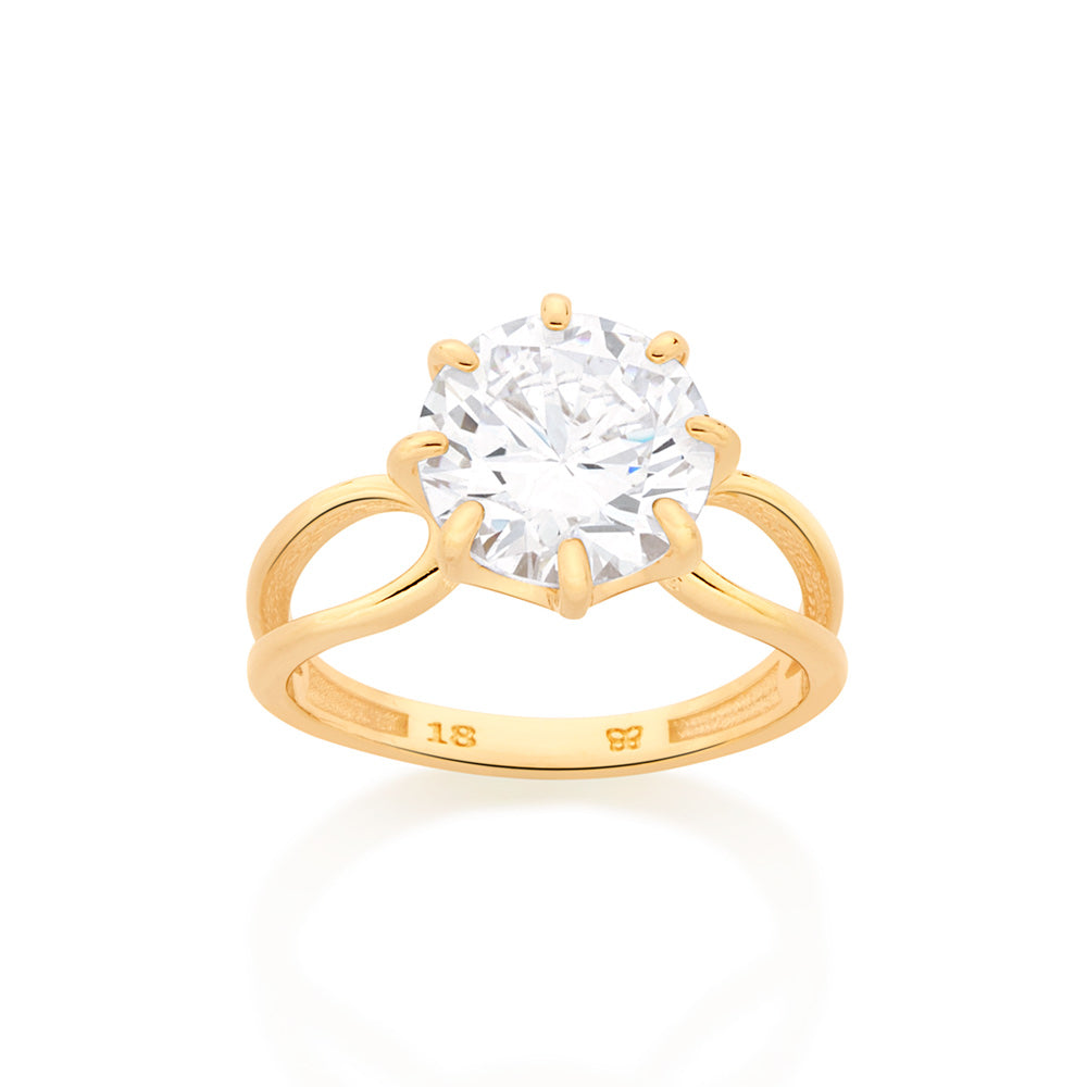 Ana hickmann latest collection with Rommanel, inheritances, highlights the important moments in your life, your relationships, and the stories we share during our walks of life. gold plated solitaire ring composed of a double band that connects at the bottom and one (1) white zirconia measuring 10mm. | stone: zirconia. | material: 18k gold plated. (licensed jewelry collection Ana hickmann - inheritances)"