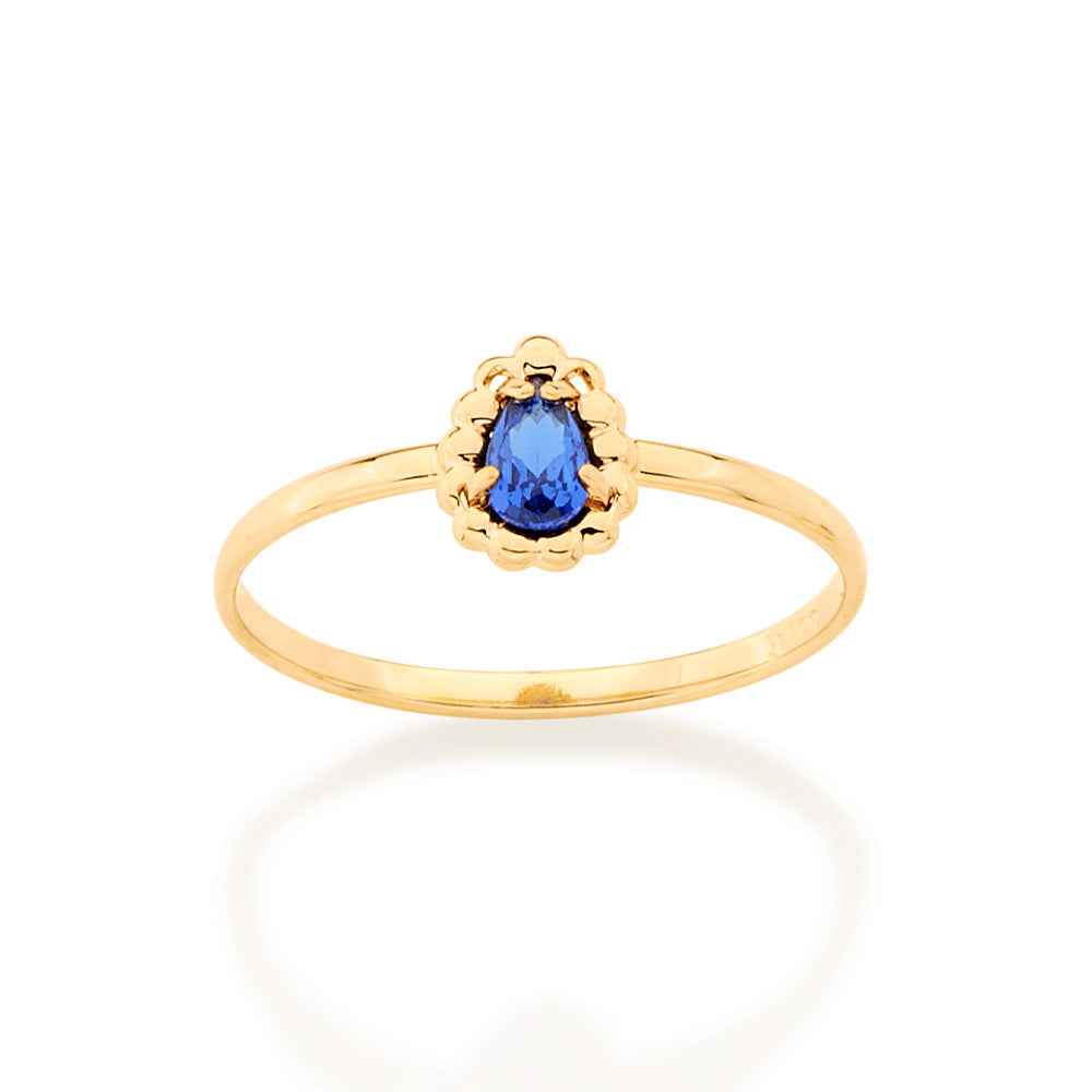 Rommanel presents its summer/spring 2021 collection, the return of joy, inspired by the enthusiasm of living life. this collection is full of youthful, energetic, and colorful pieces! gold plated skinny ring composed of one (1) blue zirconia in the shape of a water droplet measuring 3x5mm at the center. | stone: zirconia. | metal: 18k gold plated. (licensed jewelry collection - the return of joy)"
