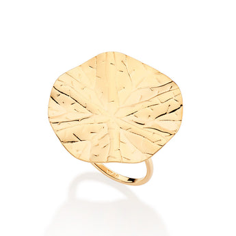 18k gold-plated maxi ring in the shape of a circle with leaf texture.