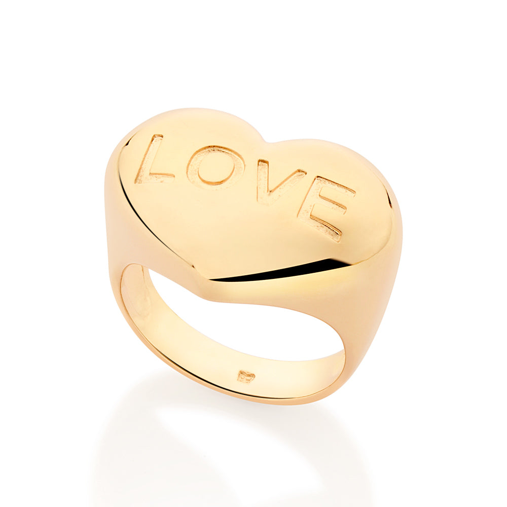 18k gold plated-plated ring in the shape of a heart with the word love engraved at the center.