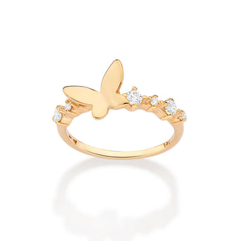 18k gold-plated skinny ring composed of one (1) mini butterfly, three (3) white zirconias measuring 1.5mm each and three (3) white zirconias measuring 2.5mm each. "