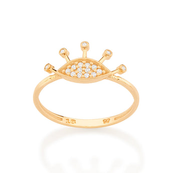 Gold plated skinny ring in the shape of a modern evil eye studded with 17 white zirconias measuring 1mm each.