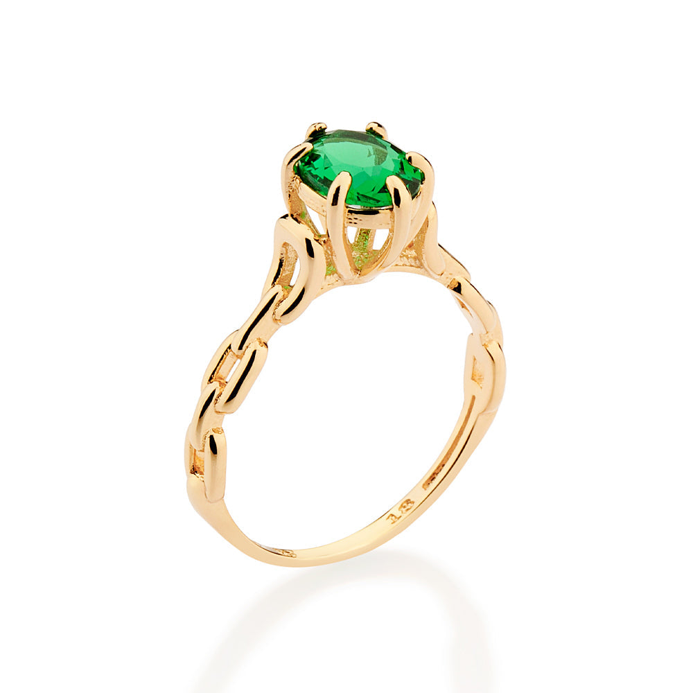 18k gold plated-plated ring composed of a chain link band and one (1) green oval crystal measuring 6x8mm at the center. size: 6 to 10 3/4. (licensed jewelry giovanna antonelli collection)