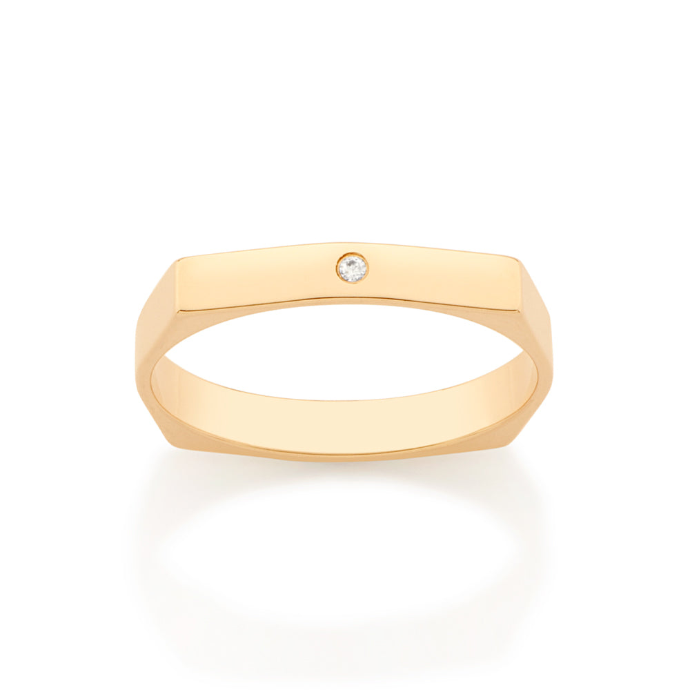 Our soulmate collection is full of romantic and delicate pieces for you and your boo to rock out together! wedding band ring in an octagon geometric shape with one (1) white zirconia measuring 1.25mm at the center. | stone: zirconia. | material: 18k gold plated.