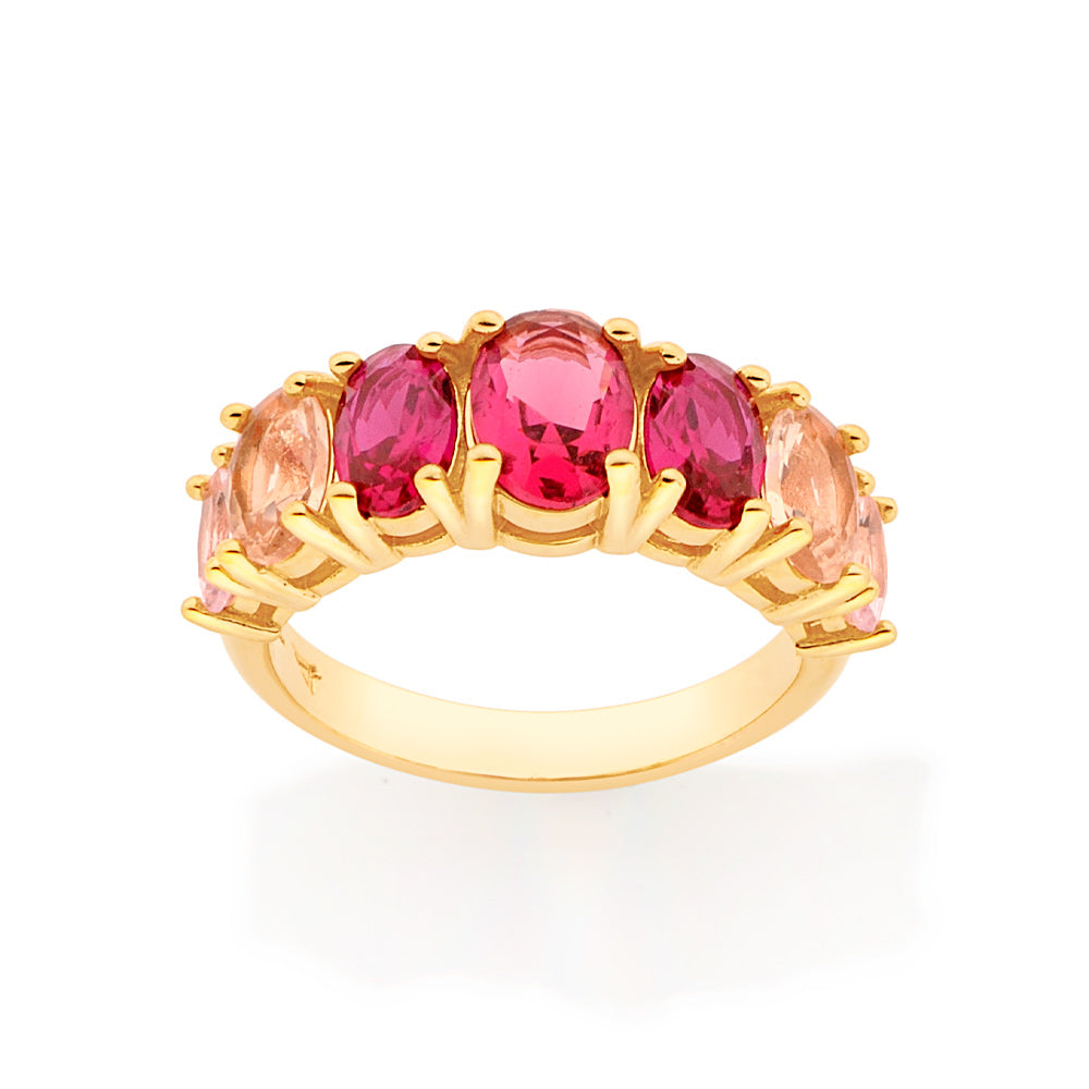 Gold plated, ring studded with 2 light pink oval crystals measuring 3x5mm,2 light pink oval crystals measuring 4x6mm, 2 pink oval zirconias measuring 4x6mm and 1 pink oval zirconia measuring 7x5mm at the center. exclusive licensed jewelry of ""ana hickmann fashion jewelry"" collection"