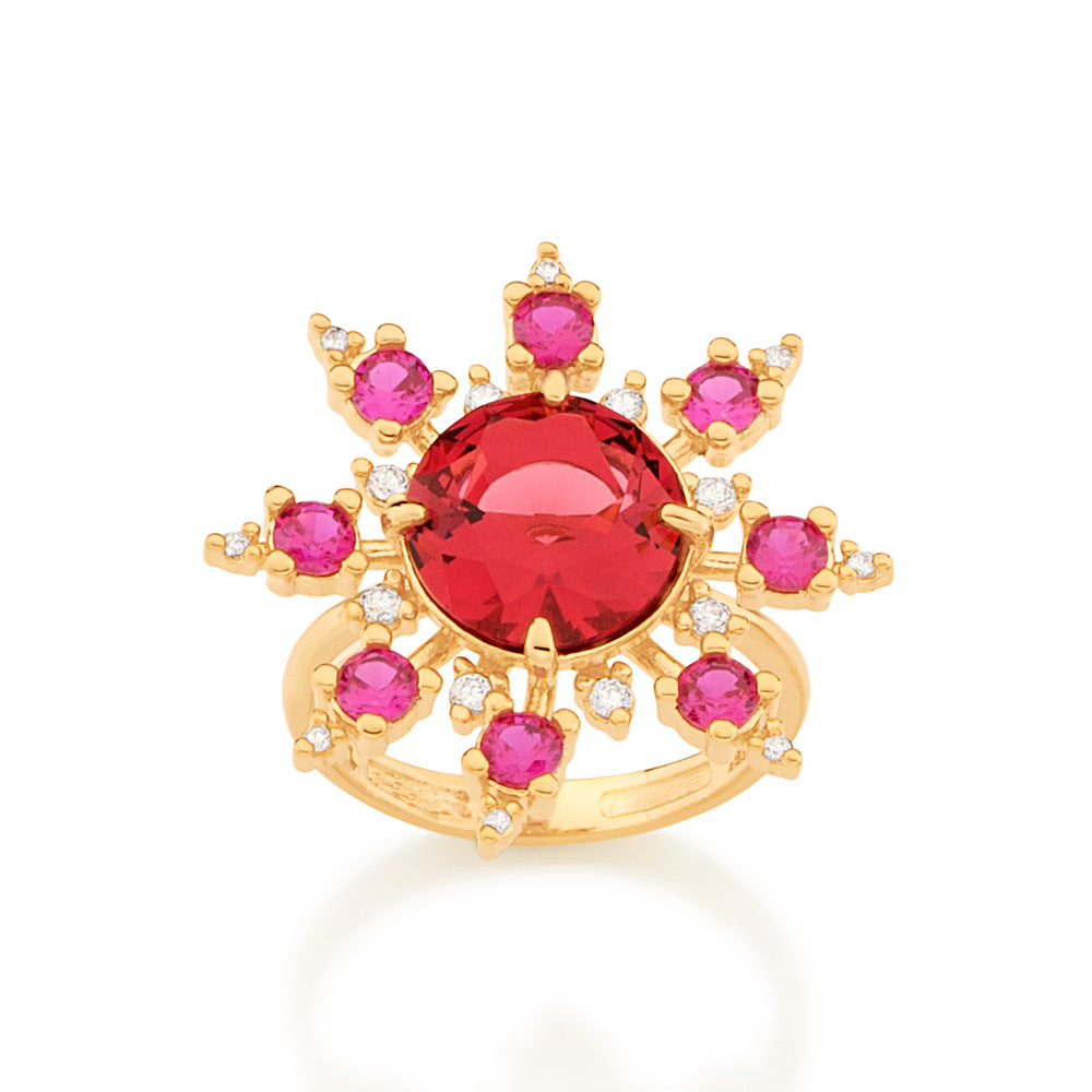 Rommanel's 2020 collection, colors of life, shows us that every color takes us to a special moment, memory, feeling, or experience in our life. by putting all those colors together, we have an amazing understanding and experience of life. in our collection's subcategoy, self love, we focused on creating stunning pieces that bring positive attitude, self confidence, and self love. gold plated ring composed of eight (8) cubic zirconias measuring 1mm each in white, eight (8) cubic zirconias measuring 3mm each in pink, eight (8) cubic zirconias measuring 1.5mm each in white, and one (1) crystal measuring 10mm in red at the center. | material: 18k gold plated. (licensed jewelry collection 2020 - 1st cycle)"