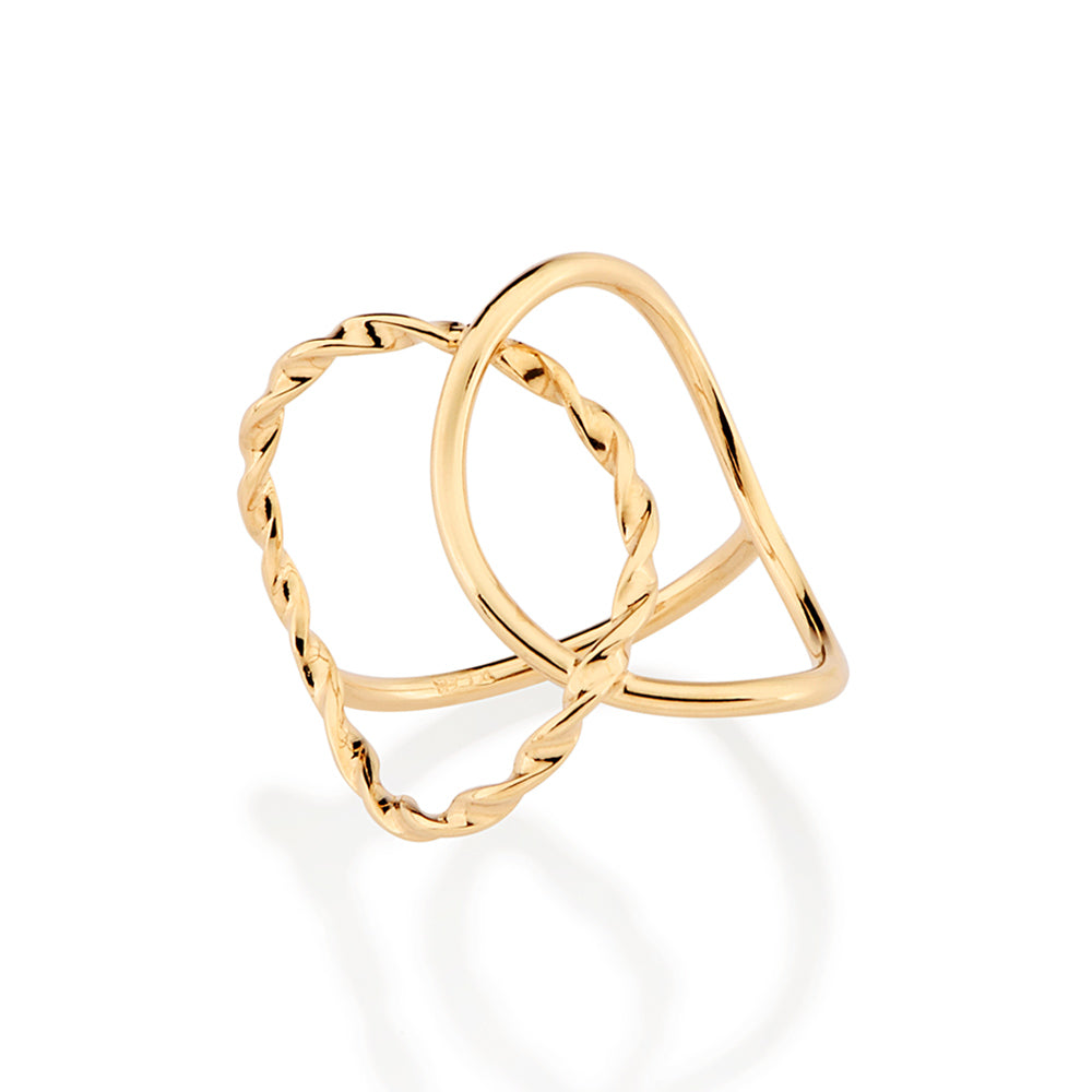 18k gold-plated maxi ring composed of two (2) circles intertwining with one having a twisted design. size: 6 to 10 3/4.