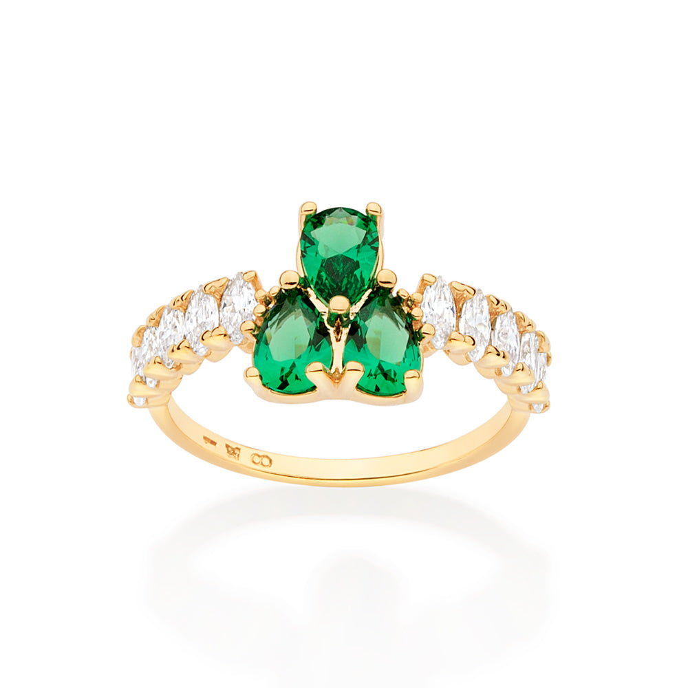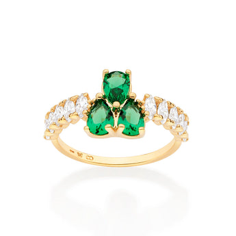 Gold plated skinny ring composed of 10 white zirconias measuring 2x4mm each and 3 green droplet zirconias measuring 4x6mm each at the center.