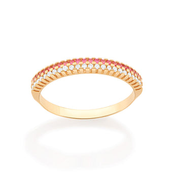 Gold plated skinny ring studded with 48 zirconias measuring 1mm each in pink and white.