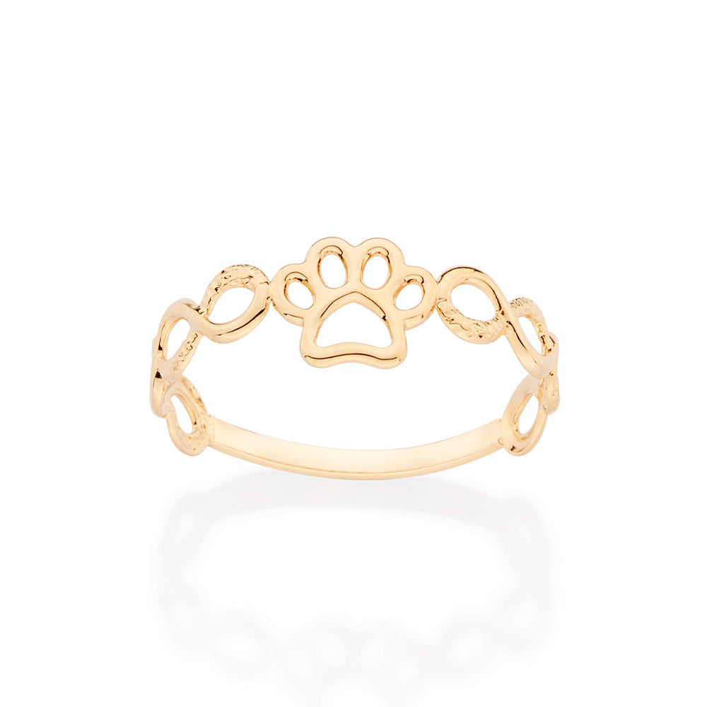18k gold plated ring composed of four (4) infinity signs on the band and one (1) paw at the center. size: 5 1/4 to 10.