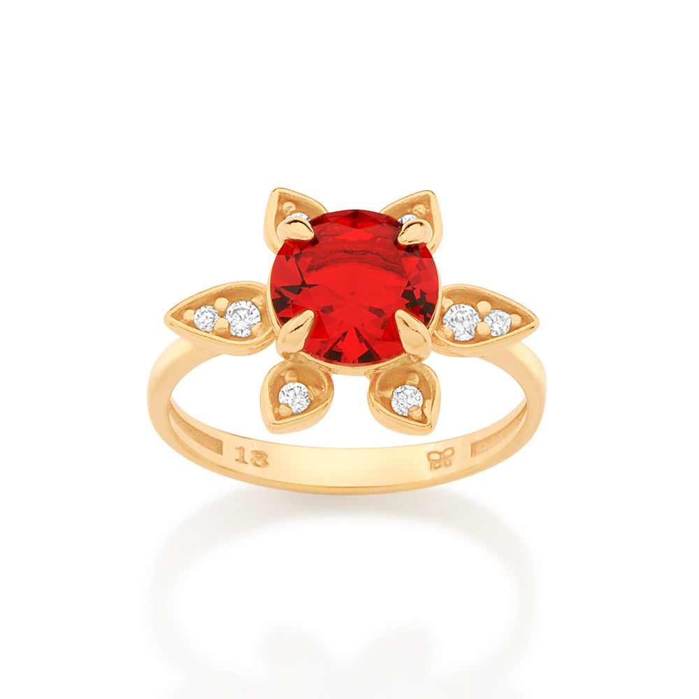 Rommanel presents its summer/spring 2021 collection, the return of joy, inspired by the enthusiasm of living life. this collection is full of youthful, energetic, and colorful pieces! gold plated ring composed of two (2) white zirconias measuring 1.75mm each, four (4) white zirconias measuring 1.5mm each, two (2) white zirconias measuring 1.25mm each, and one (1) red crystal measuring 8mm at the center. | stone: zirconia. | metal: 18k gold plated. (licensed jewelry collection - the return of joy)"