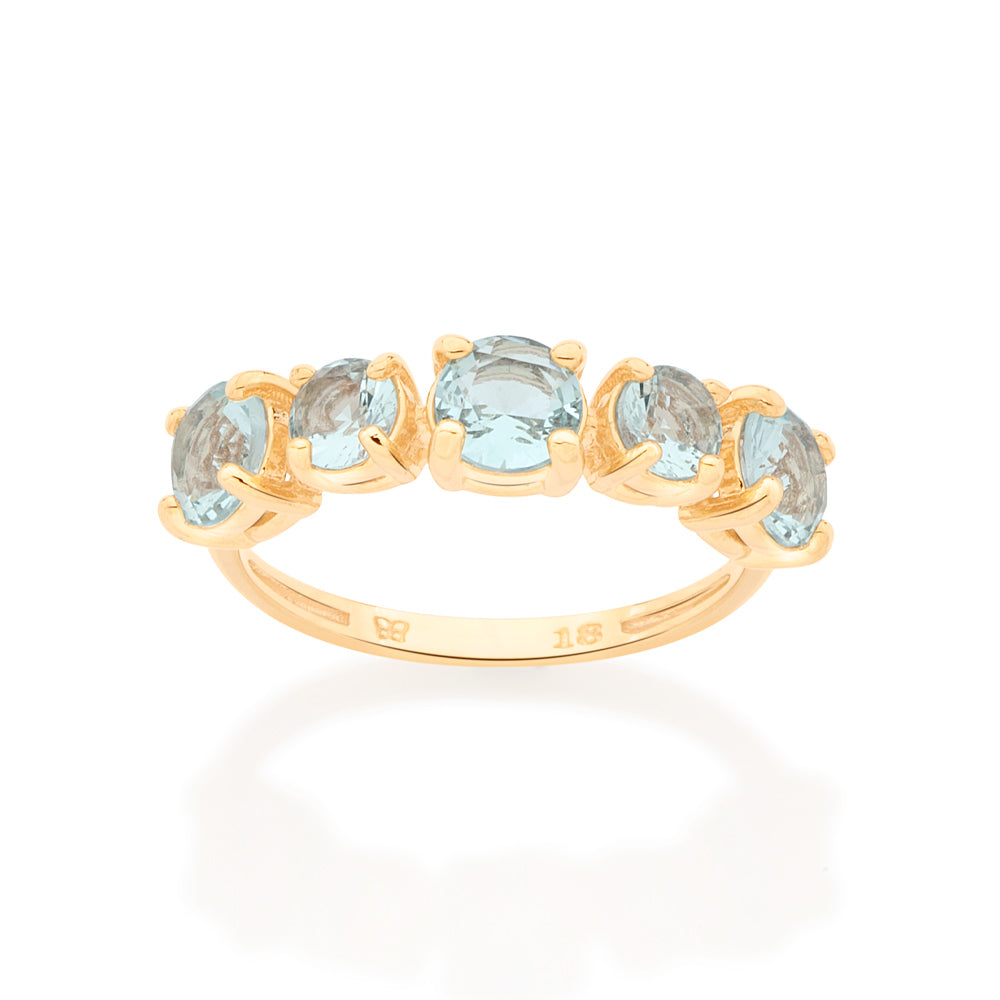 Rommanel is proud to present another collection, breaking dawn, with brazilian celebrity, Ana hickmann. this collection was inspired by the new beginnings that everyday brings us. gold plated ring composed of three (3) light blue crystals measuring 5mm each, and two (2) light blue crystals measuring 4mm each. | stone: crystal. | material: 18k gold plated. (licensed jewelry collection - breaking dawn by Ana hickmann)"