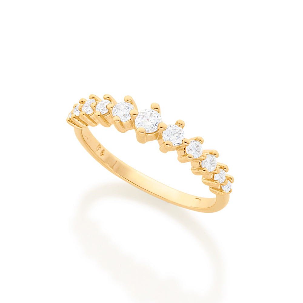Rommanel is so proud to announce our ten years anniversary collection with Ana hickmann - celebrate! this collection is full of beautiful pieces for you to wear, just in time for the holidays. gold plated skinny ring composed of two (2) white zirconias measuring 1.50mm each, two (2) white zirconias measuring 1.75mm each, four (4) white zirconias measuring 2mm each, two (2) white zirconias measuring 2.50mm each, and one (1) white zirconia measuring 3mm at the center. | stone: zirconia. | material: 18k gold plated. (licensed jewelry collection Ana hickmann - celebrate)"