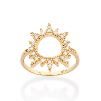 Gold plated ring in the shape of the sun with a hollow center studded by 16 zirconias measuring 1.25mm each and 8 zirconias measuring 1mm each. exclusive licensed jewelry of giovanna antonelli fashion jewelry collection