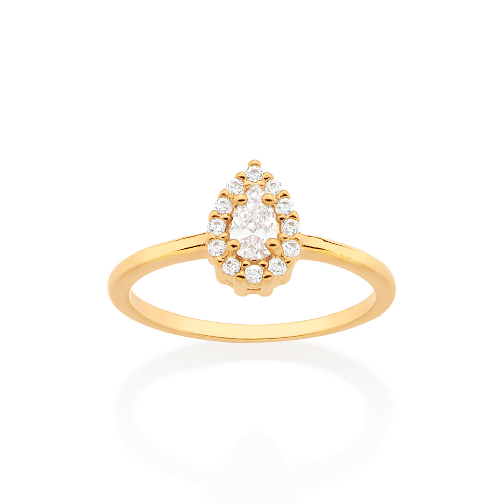 Gold plated engagement ring studded by 12 white zirconias measuring 1.25mm each and 1 droplet zirconia measuring 3x5mm at the center.