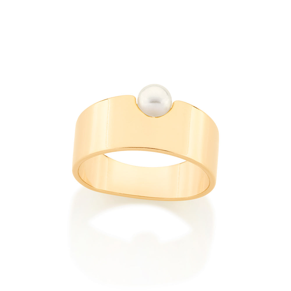 Rommanel presents another collection with our muse Ana hickmann, eternal love, which was inspired by the depth of a Mothers day love. gold plated ring with a thick band featuring one (1) synthetic pearl measuring 5mm at the center. | stone: synthetic pearl. | material: 18k gold plated. "