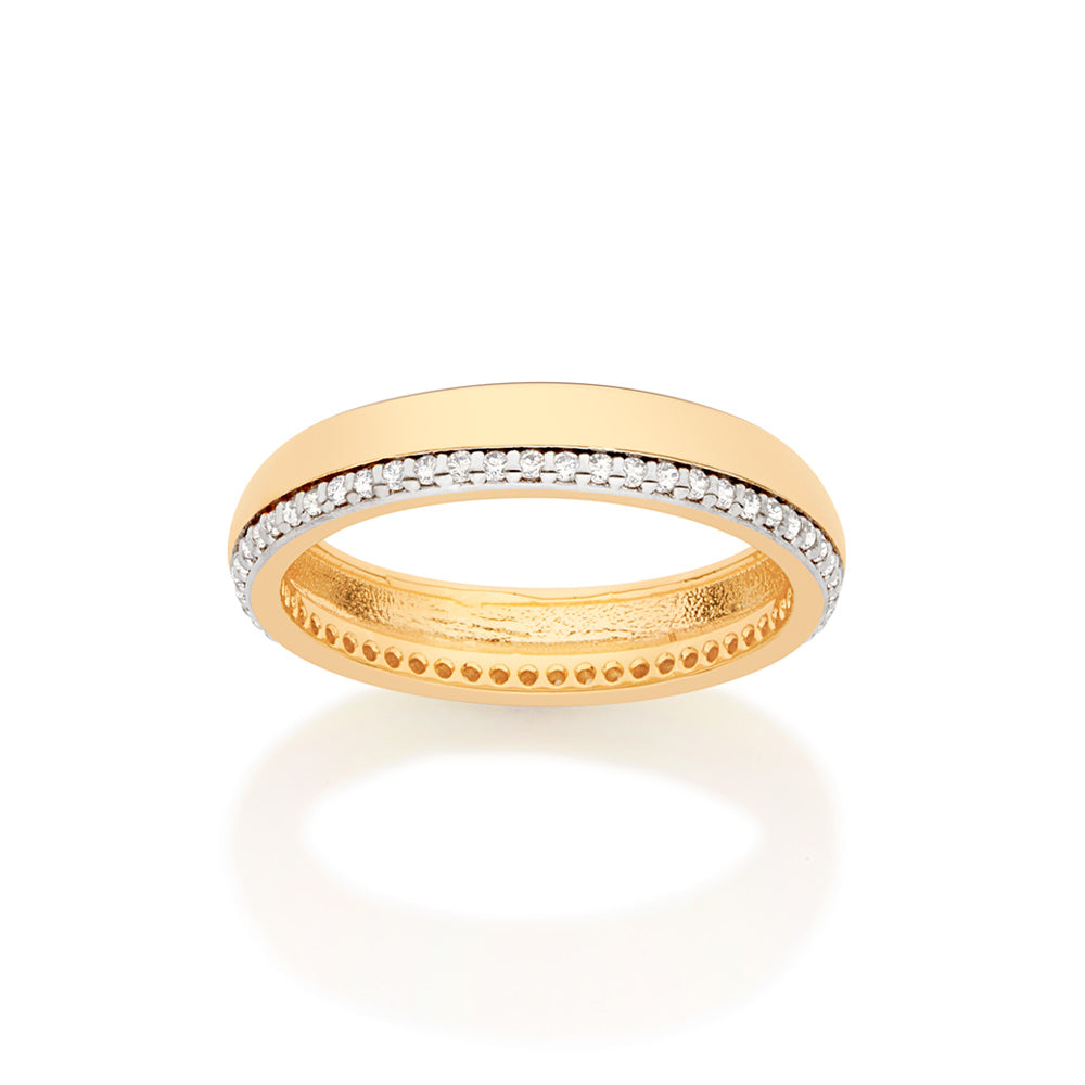 Rommanels classic collection is full of timeless pieces that will be in style for years to come. it is the perfect collection to find everyday items that can be used in multiple ways! gold plated wedding band ring composed of forty-eight (48) white zirconias measuring 1mm each studding half of the band with rhodium application behind it. | stone: zirconia. | metal: 18k gold plated.