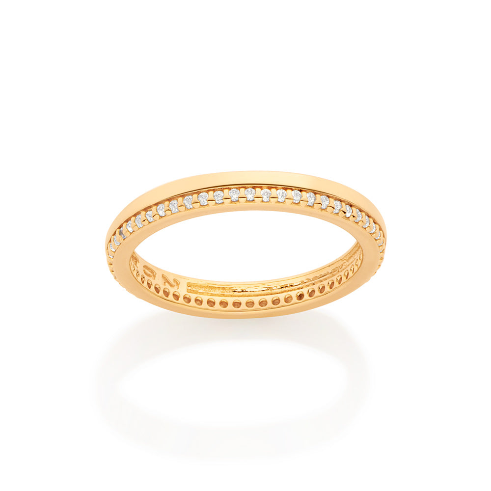 Rommanels classic collection is full of timeless pieces that will be in style for years to come. it is the perfect collection to find everyday items that can be used in multiple ways! gold plated wedding band ring composed of forty-eight (48) white zirconias measuring 1mm each studding half of the band. | stone: zirconia. | metal: 18k gold plated.