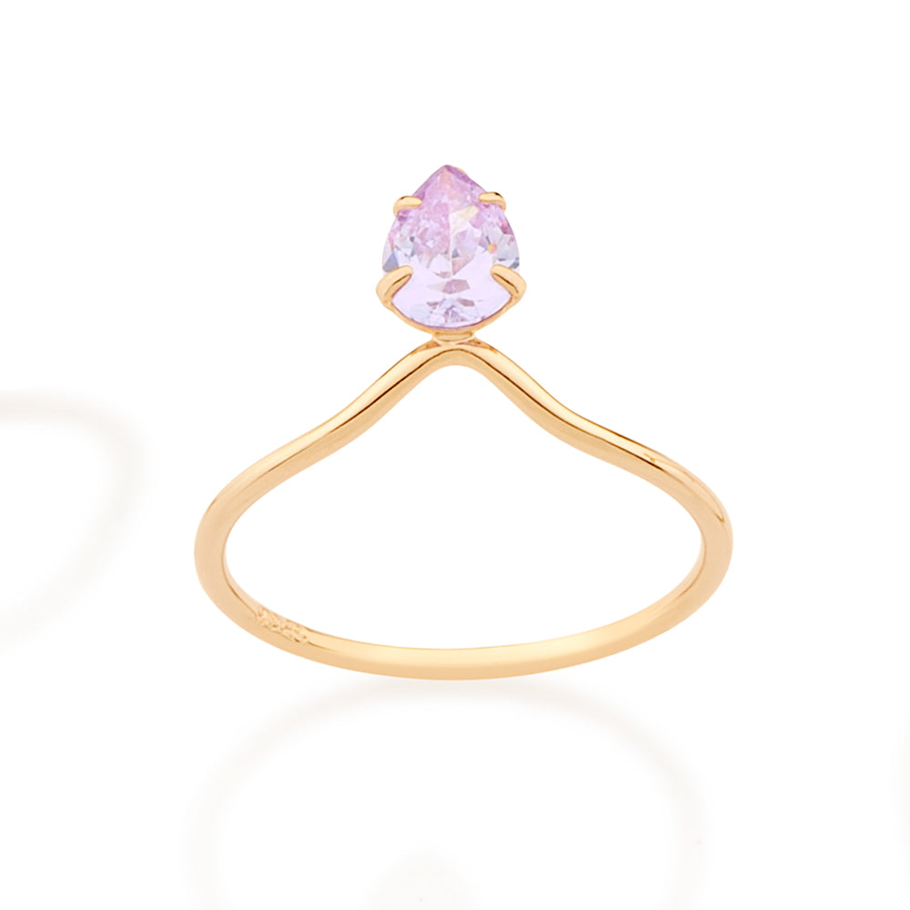 The miss violet collection was inspired by the color of the year and by violets a lovely, and delicate flower. Rommanel has brought the essence of these flowers to the collection and created jewelry that is full of meaning. let yourself be carried away by the delicacy of these flowers too. gold plated ring composed of a thin, curved band with one (1) light pink zirconia in the shape of a water droplet measuring 5x7mm. part of our pink delicacy line, this ring adds a touch of color while still maintaining a delicate look. pair it with the matching earring and bracelet to complete the entire look. | material: 18k gold plated. | also available in white and lilac. "