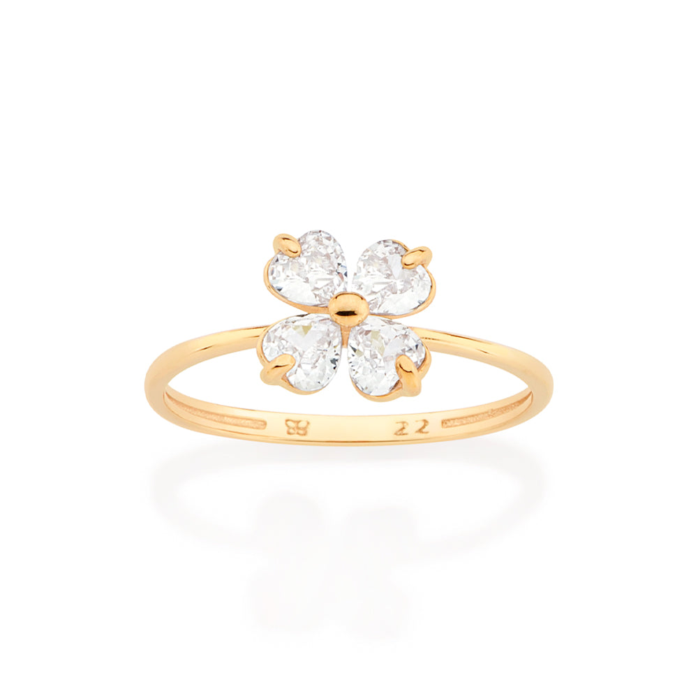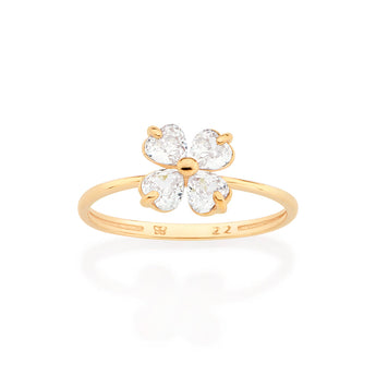 Gold plated skinny ring in the shape of a flower composed of 4 white zirconias measuring 4mm each.