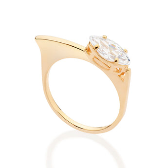 18k gold plated-plated skinny ring with a pointed edge and studded by one (1) white zirconia measuring 5x10mm. exclusive of ana hickmann collection