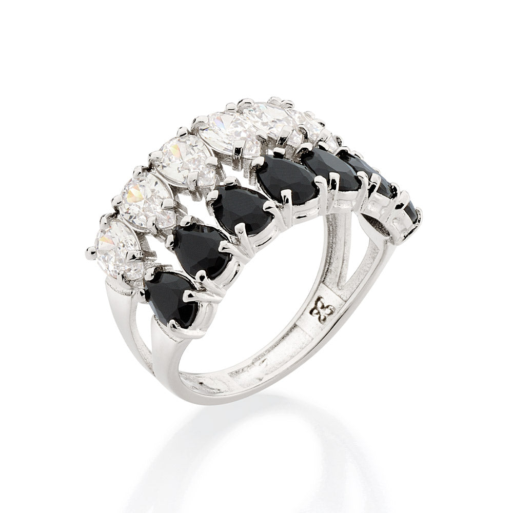 Platinum maxi ring composed of a double band studded with 7 white zirconias in the shape of dew drops measuring 4x6mm each and seven (7) black crystals in the shape of dew drops measuring 4x6mm each. exclusive licensed jewelry of ""ana hickmann fashion jewelry"" collection"