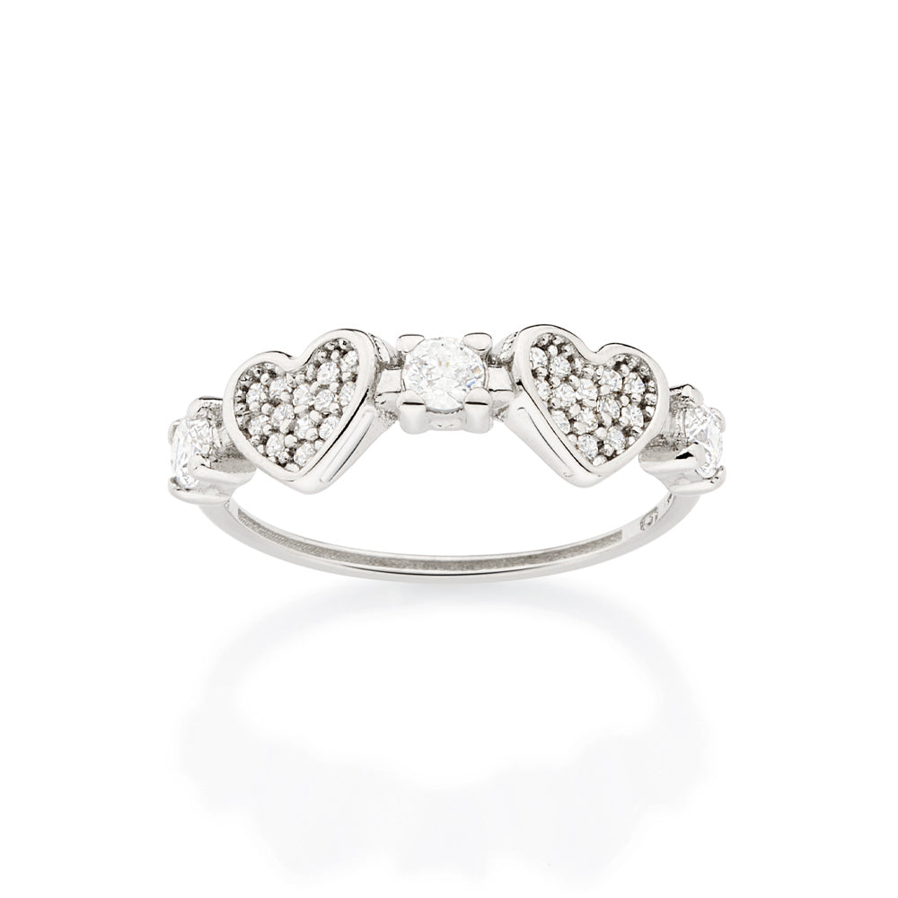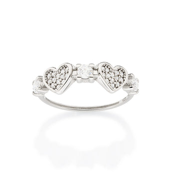 Platinum skinny ring composed of 2 hearts studded with 26 white zirconias measuring 1mm each and 3 white zirconias measuring 3mm each in between the hearts.
