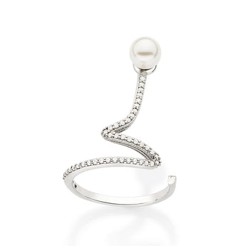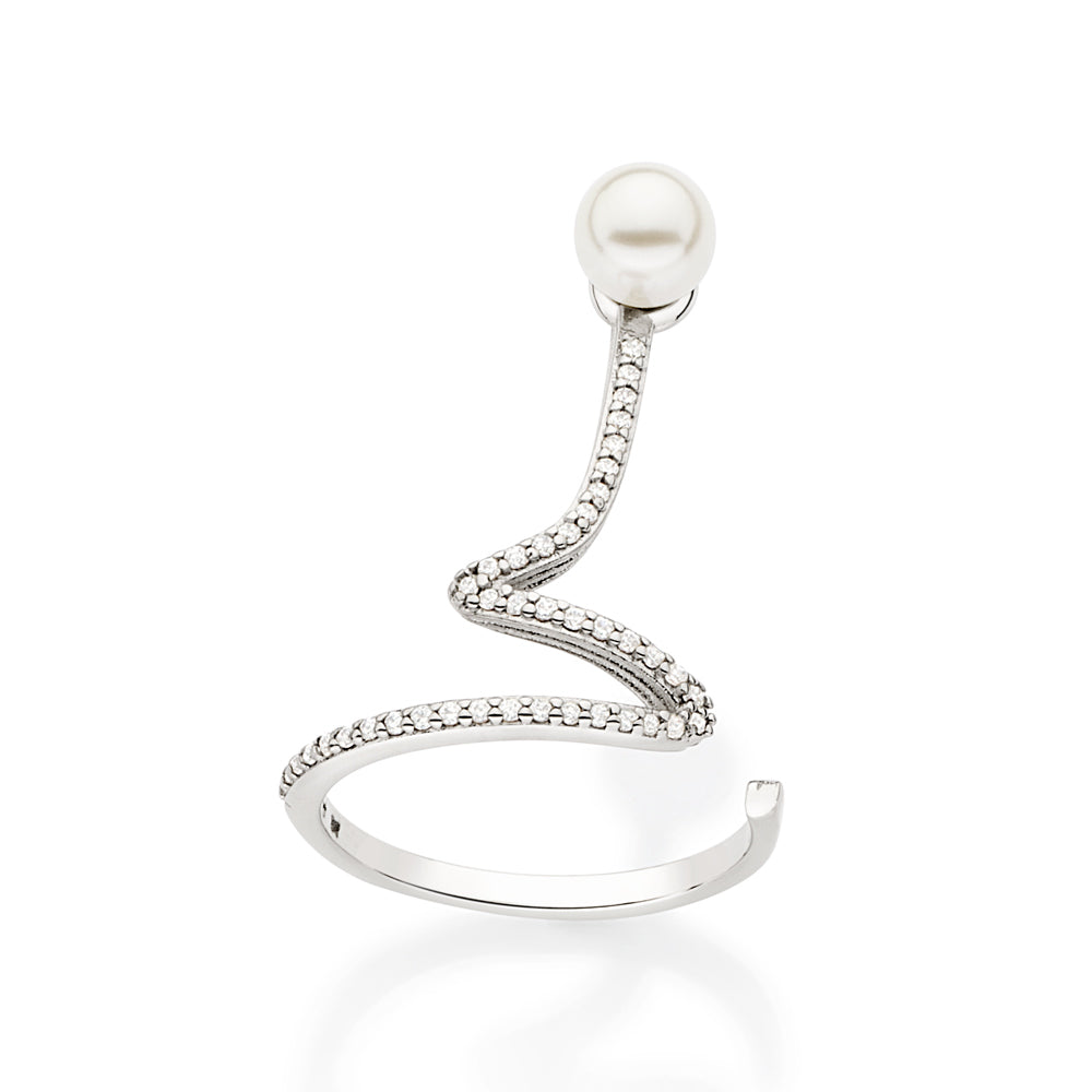 Platinum maxi ring studded with 41 white circle zirconias measuring 1mm each and 1 pearl measuring 6mm at the tip.