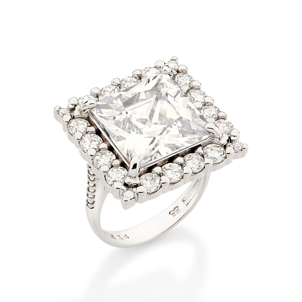 Platinum square maxi ring studded with 1 white square zirconia measuring 12mm at the center, 16 white circle zirconias measuring 3mm each around it, 4 white circle zirconias measuring 1.5mm each at the tips, and 12 white circle zirconias measuring 1mm each on the side of the band. "