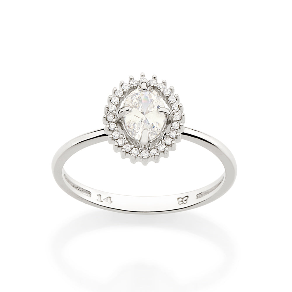 Platinum solitaire ring studded with 24 white zirconias measuring 8mm each and 1 white oval zirconia measuring 4x6mm at the center.