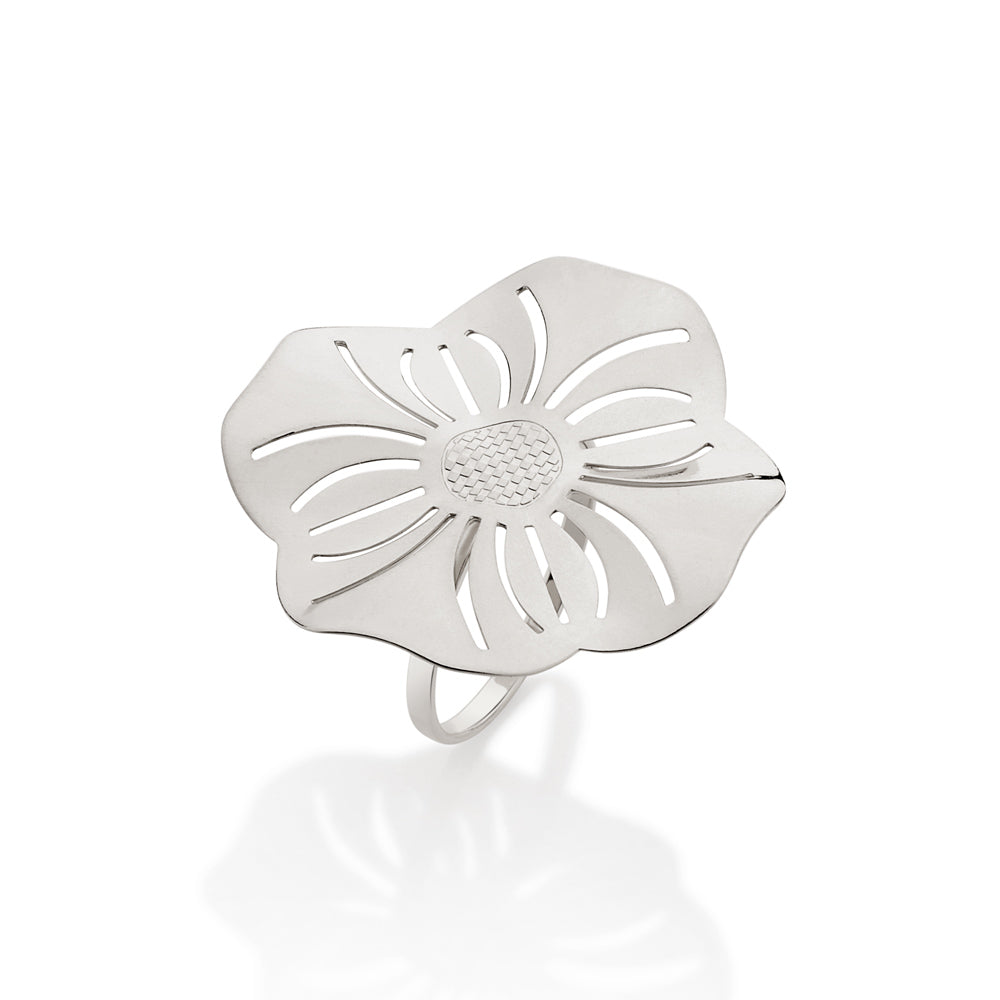 Rommanel's newest collection by Ana hickmann brings the beauty and glamour of the caribbean waters. inspired by the tropical climate and vibrant colors of the caribbean, the collection features pieces that convey the magical, joyful and contagious energy of curaã‡ao, a dutch island located in the caribbean sea. rhodium ring composed of a detailed flower as the centerpiece. | material: 18k rhodium plated.â | also available in gold plated. (licensed jewelry collection Ana hickmann 21st edition)"
