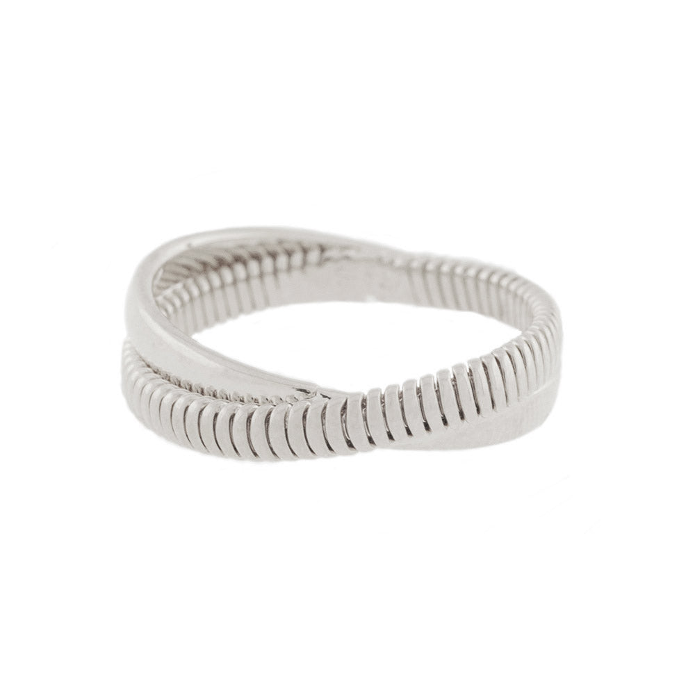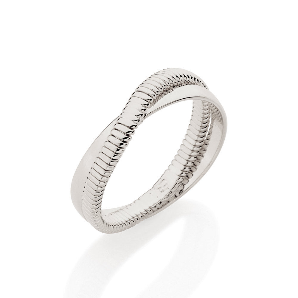 Ring formed by intertwined hoops, one smooth and the other worked.