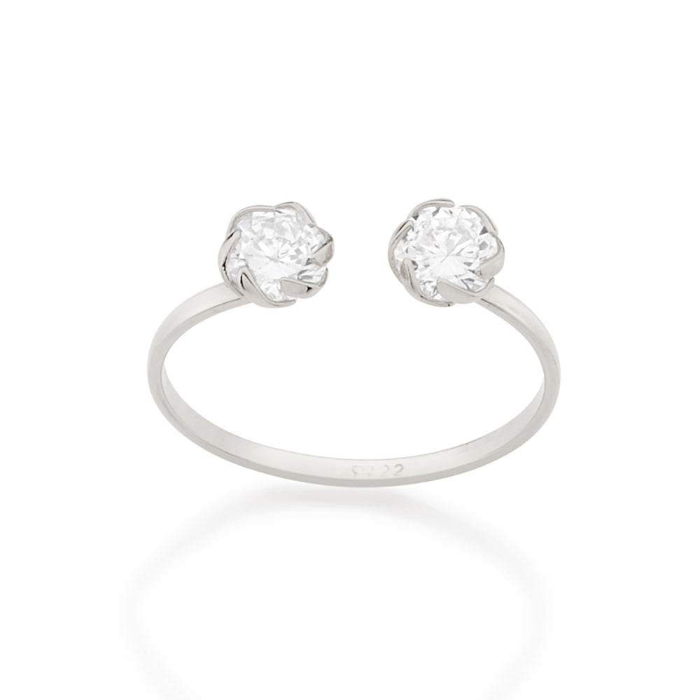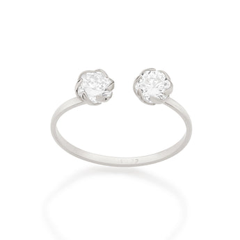 Rommanels celebrate collection was inspired by gratitude a feeling that always surrounds us during celebrations. this collection features delicate and timeless pieces that showcase our stunning colored zircons. enjoy the thrill of giving and being gifted with this collection. rhodium adjustable ring composed of two (2) white round zirconias measuring 5mm each at the ends. for our matching set lovers, pair it with our point of light earring to create a complete look. | metal: rhodium plated. | also available in gold plated. "