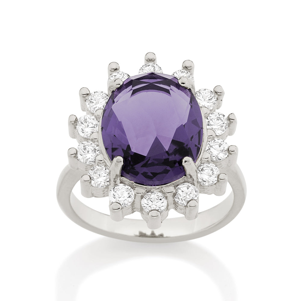 Rommanels dream collection by giovanna antonelli has as its main inspiration the world of dreams. as the name suggests, the royalty line was inspired by queens and princesses. to represent this majestic universe, we brought some of high jewelry’s classic shapes and colored zirconia – inspired by precious stones. rhodium ring composed of fourteen (14) white zirconias measuring 2.5mm each and one (1) purple oval crystal measuring 10x12mm at the center. add a touch of color and elegance to your look with this stunning regal inspired ring. | metal: rhodium plated. | available in gold plated. (licensed jewelry collection giovanna antonelli 12th edition)"