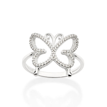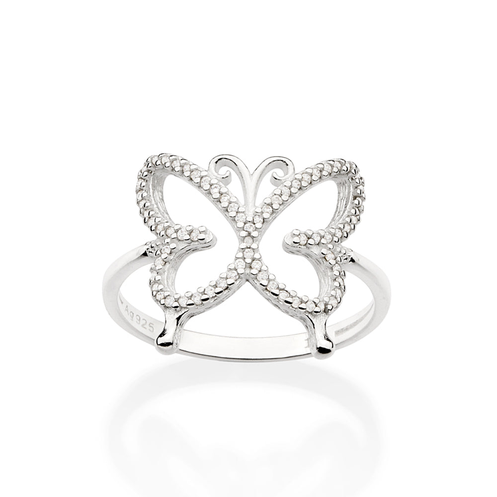 Silver 925 skinny ring in the shape of a butterfly studded by 67 white zirconias measuring 0.8mm each. size: 5 1/4 to 10 3/4.