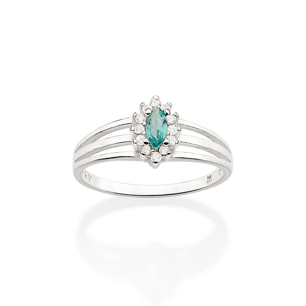 Silver 925 solitaire ring composed of three (3) bands studded by twelve (12) white zirconias measuring 1mm each and one (1) green zirconia measuring 2.5x5mm at the center.