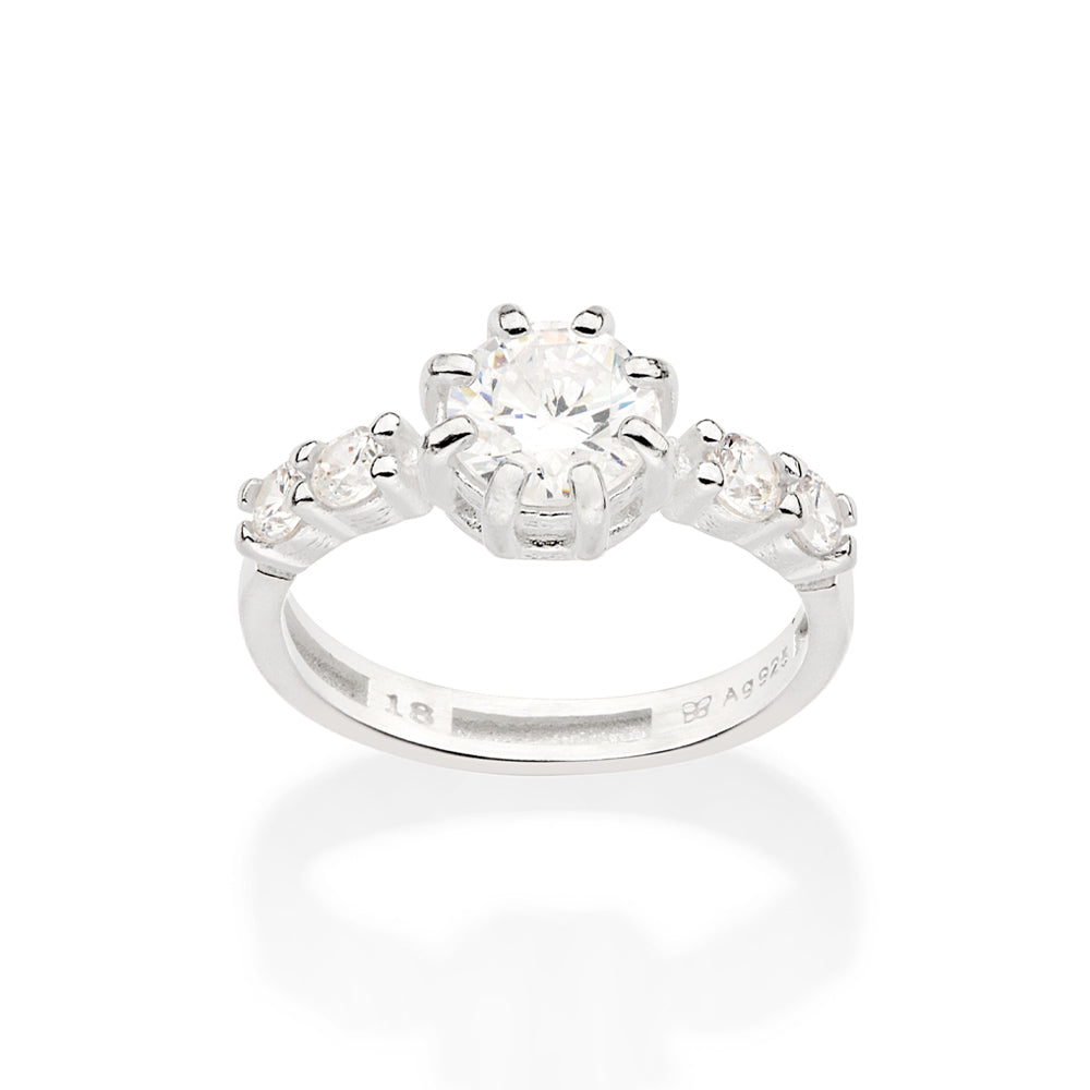 Silver 925 solitaire ring composed of four (4) white zirconias measuring 3mm each and one (1) white zirconia measuring 7mm at the center. size: 6 to 10 3/4.