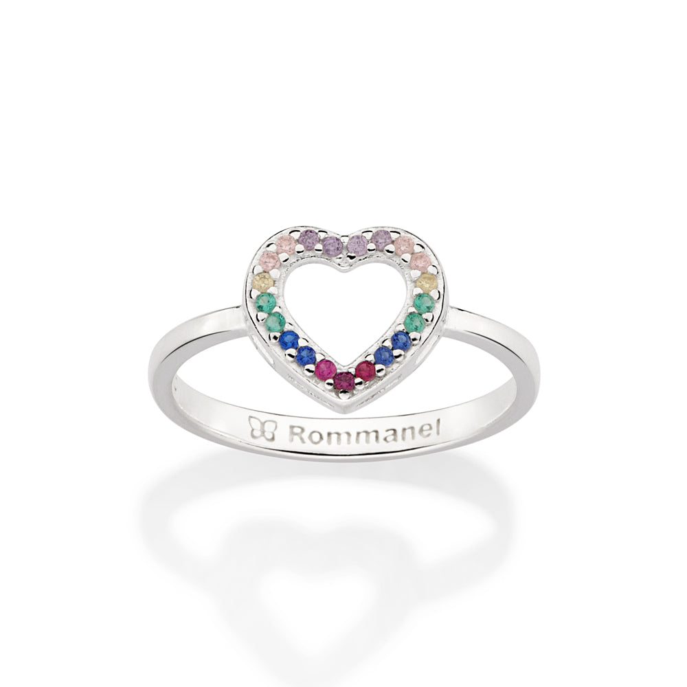 Silver 925 ring composed of a hollow heart studded by twentyone (21) colorful zirconias measuring 1mm each. size: 6 to 10.