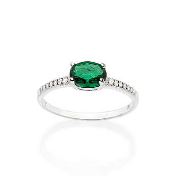 Silver 925 engagement ring composed of fourteen (14) white zirconias measuring 0.8mm each and one (1) green oval crystal measuring 5x7mm at the center. size: 5 1/4 to 10 3/4.