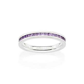 Silver 925 thin wedding band studded by thirty-eight (38) purple zirconias measuring 1.75mm each (quantity of zirconias can change depending on ring size).
