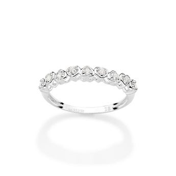 SILVER 925 SKINNY RING COMPOSED OF NINE (9) ALTERNATING HEARTS, EACH SET WITH A 1.5MM WHITE ZIRCONIA, SHIMMER LIKE DEW DROPS TOUCHED BY SUNRISE. A PLAYFUL YET ROMANTIC PIECE THAT SHINES WITH EVERY TURN.