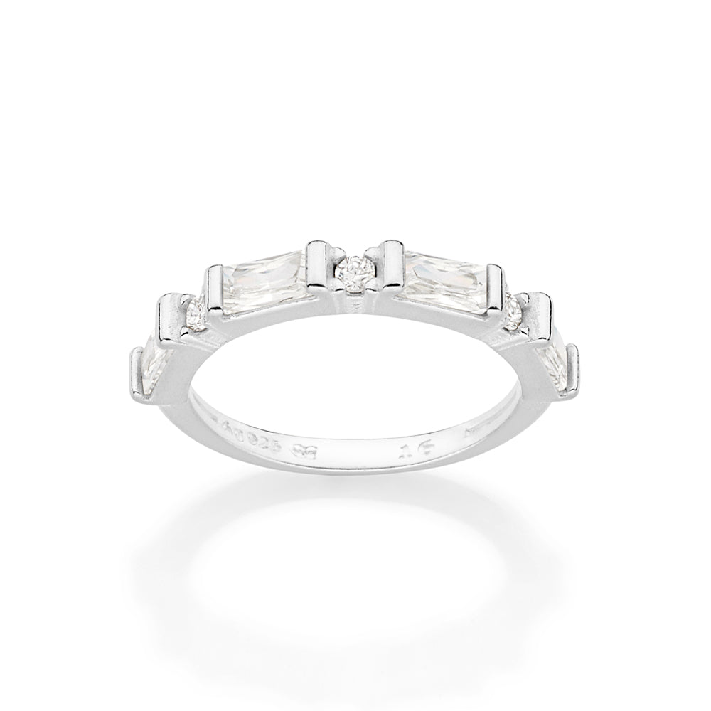 Silver 925 skinny ring composed of four (4) baguette zirconias measuring 2.5x5mm each and three (3) zirconias measuring 2mm each. size: 5 1/4 to 10 3/4.
