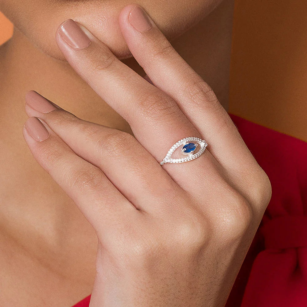 Silver 925 skinny ring in the shape of a greek eye studded by thirty-four (34) white zirconias measuring 0.8mm each, two (2) white zirconias measuring 1.5mm each and one (1) blue crystal at the center measuring 3x5mm. size: 6 to 10 3/4.?(licensed jewelry collection giovanna antonelli) "