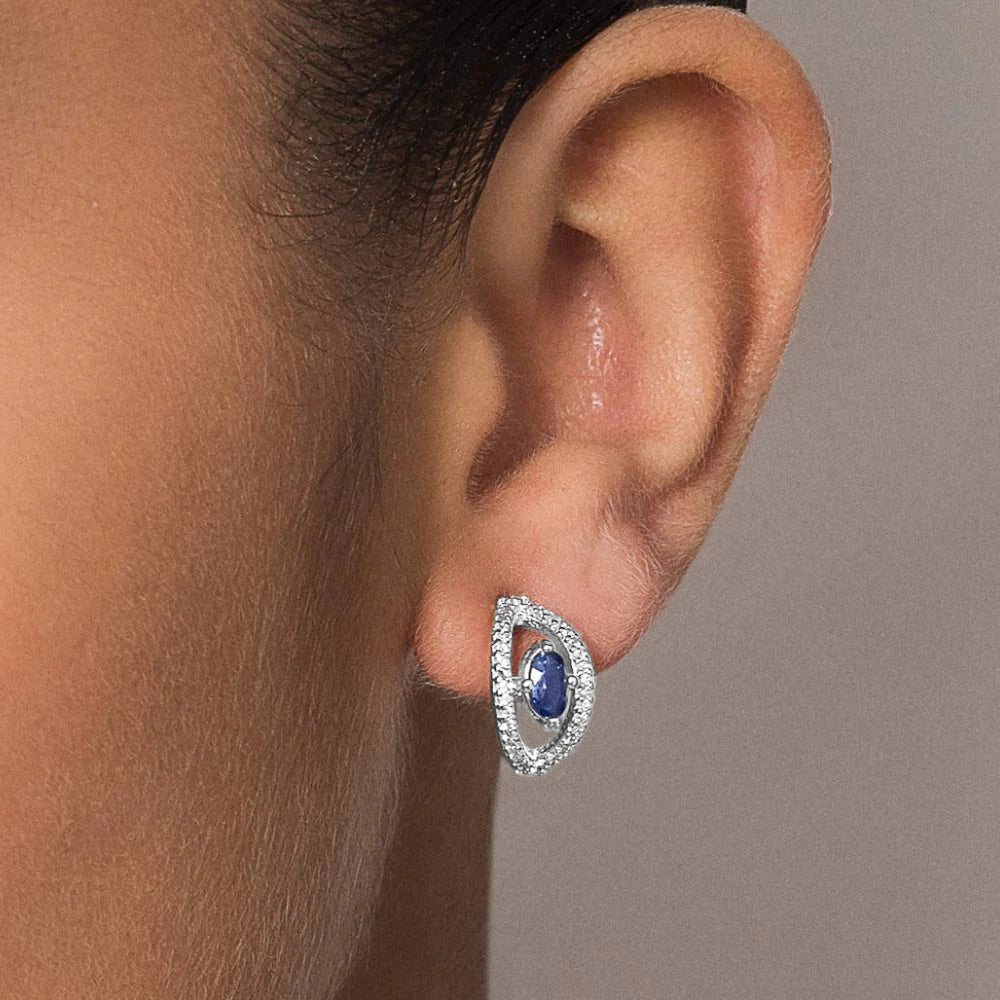 Silver 925 hoop earrings with a greek eye design studded by sixty-eight (68) white zirconias measuring 0.8mm each, four (4) white zirconias measuring 1.5mm each and two (2) blue oval crystals measuring 3x5mm each. size: 0.71in x 0.51in. (licensed jewelry collection giovanna antonelli) "