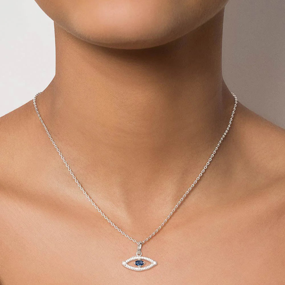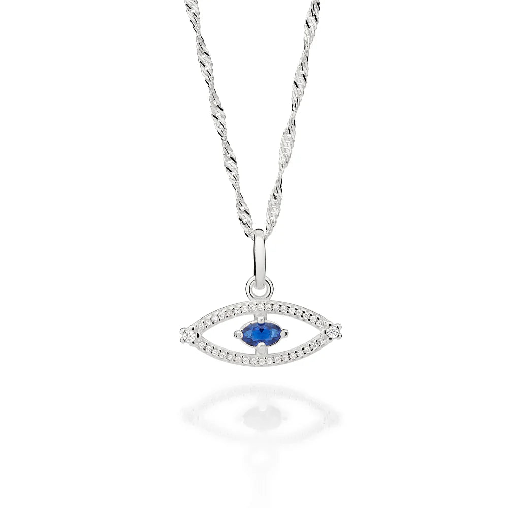 Silver 925 pendant in the shape of a greek eye studded by thirty-four (34) white zirconias measuring 0.8mm each, two (2) white zirconias measuring 1.5mm each and one (1) blue crystal measuring 3x5mm at the center. size: 0.63in x 0.75in. (licensed jewelry collection giovanna antonelli) "