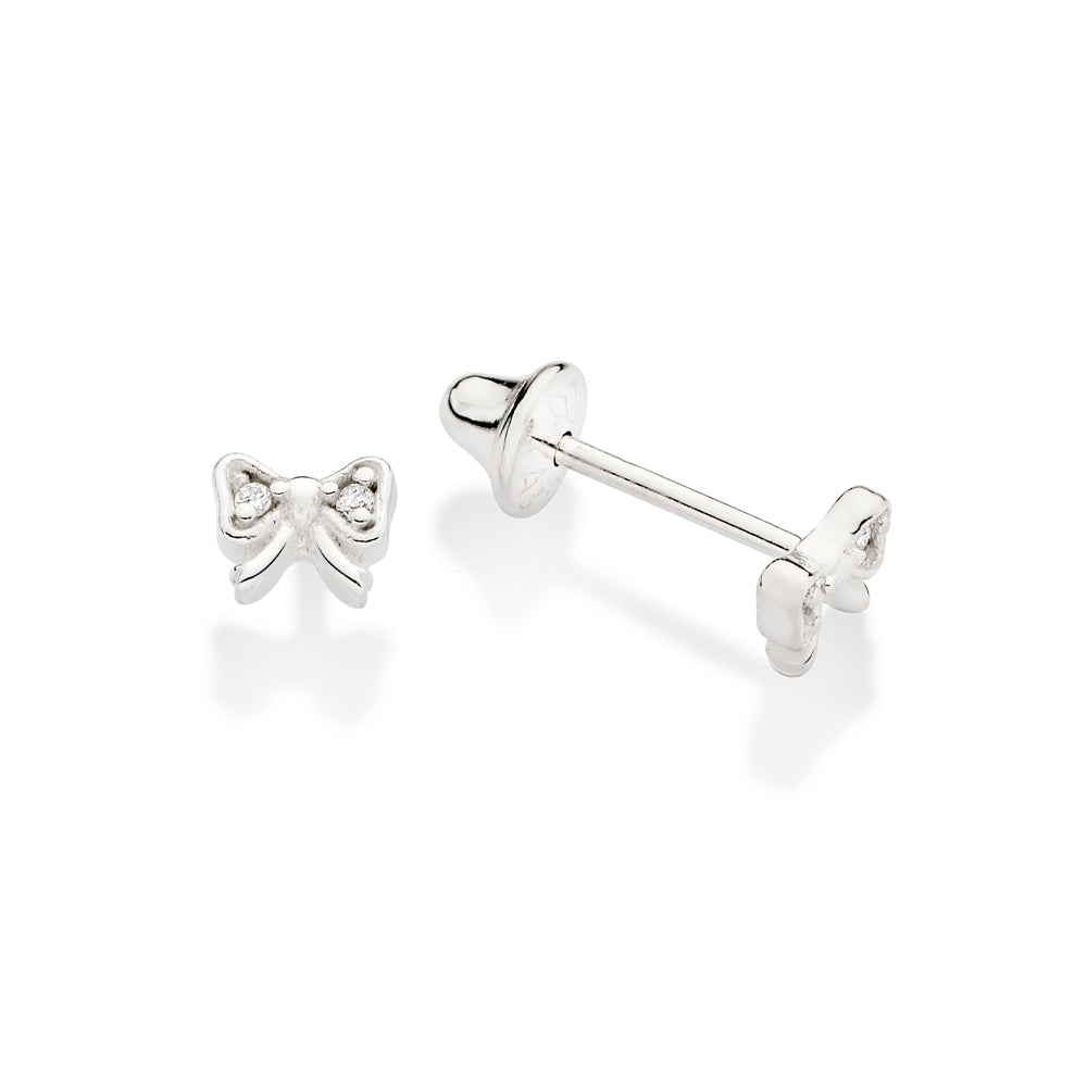 Silver 925 stud earrings in the shape of a bow studded by four (4) white zirconias measuring 1mm each. size: 0.3cm x 0.5cm (0.1in x 0.2in).