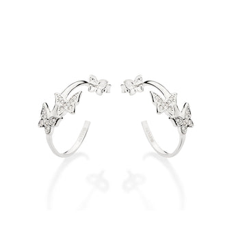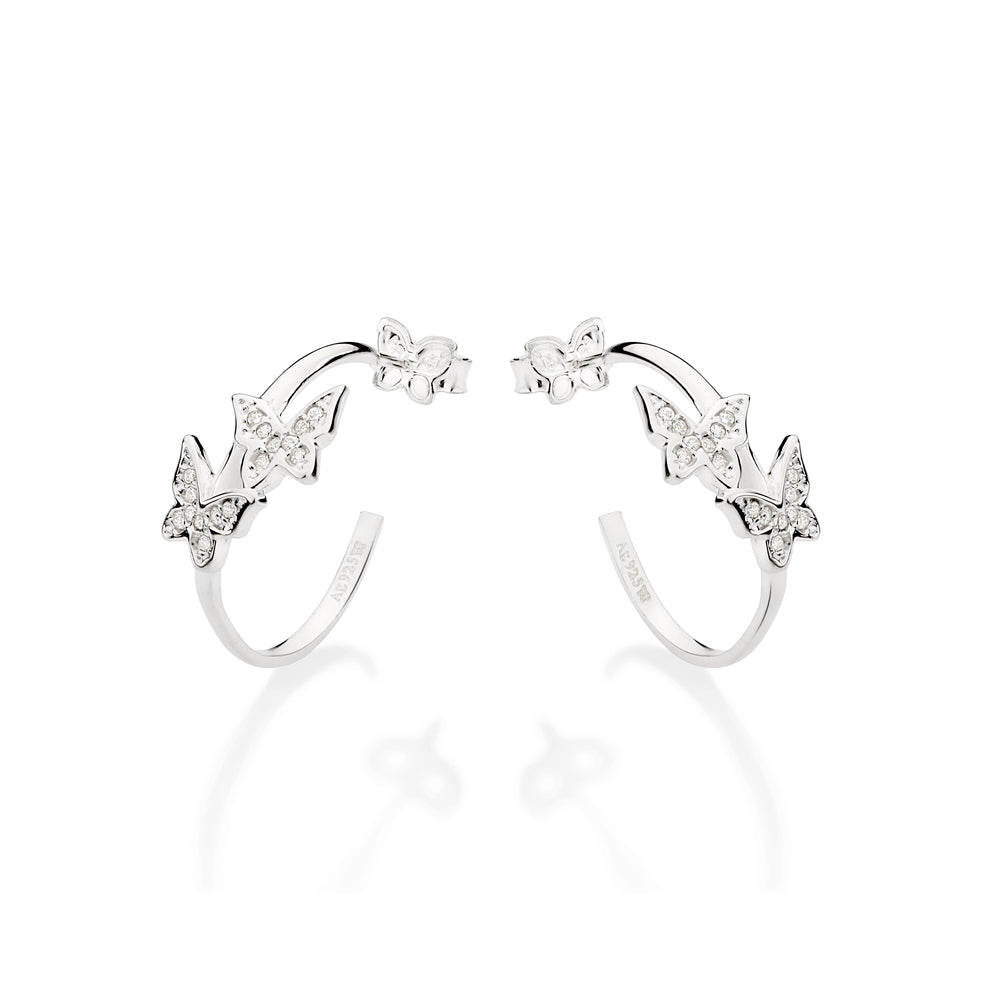 Silver 925 hoop earrings composed by four (4) butterflies studded by thirty-two (32) white zirconias measuring 1mm each. size: 2.3cm (0.91in).