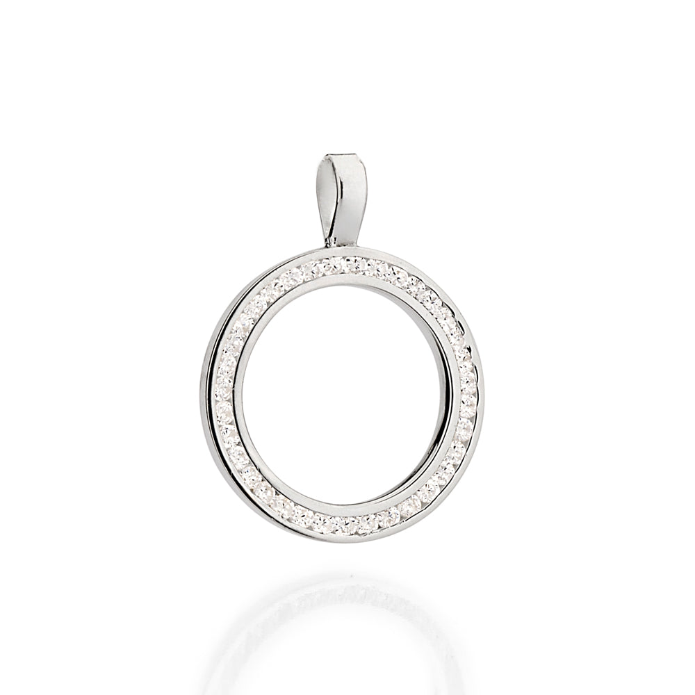 Silver 925 pendant in the shape of a circle with a hollow center studded by thirty-four (34) white zirconias measuring 1.75mm each. size: 1.1in x 0.83in.